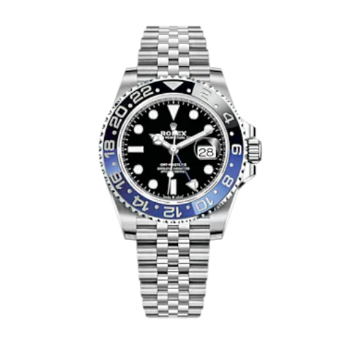 This model features a black dial and a two-colour Cerachrom bezel insert in blue and black ceramic. Designed to show the time in two different time zones simultaneously during intercontinental flights, the GMT-Master II has come to be recognized for its robustness and versatile appearance.